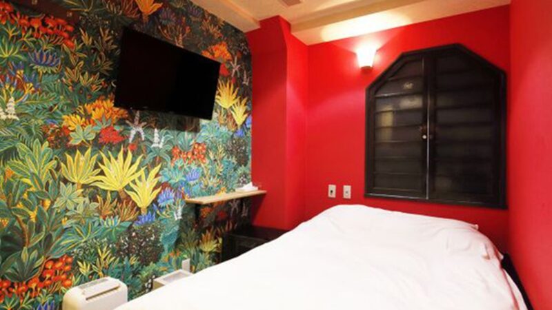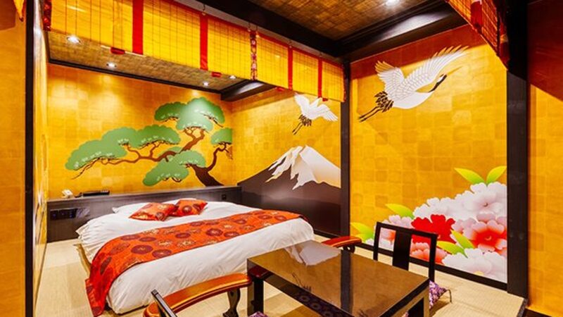 ネオ・ジャパネスクをテーマにした館内には、お殿様気分を味わえる殿様ルーム、遊郭をモチーフにした花魁ルーム、金魚が泳ぐアクアリウム付きのお部屋、貝殻ベッドを備えたお部屋など、エキゾチックでラグジュアリーな空間が揃っています。